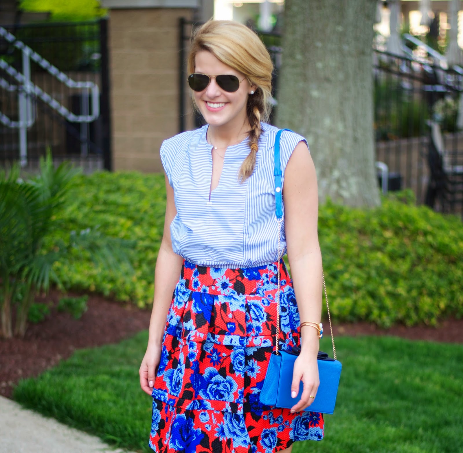 These photos are from a night having dinner at our club. It was SO hot out. Really, we've been hitting 80 degrees regularly lately, so pants are just not an option. I will usually reach for a skirt before shorts, just because it is slightly more dressed up but also because it's even breezier than shorts! This was an easy thing to wear to work and then transitioned very well into the evening. I paired this with a black halter for a night out a few weeks ago, too! It was dressier and more 'fun' rather than the more conservative look I am sharing today! Have a fabulous day!