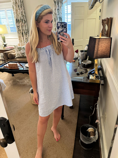 Lake sent me this nightgown for my birthday which was the sweetest surprise. The seersucker fabric is adorable and super lightweight. I love traveling with nightgowns because they take up much less space than a pajama set! I'm wearing a size small!